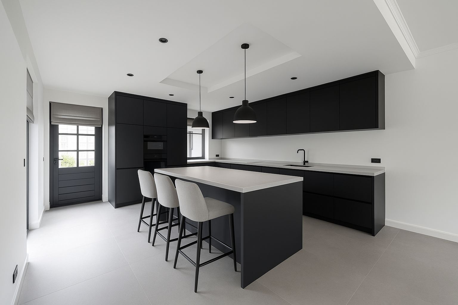 Onze moderne keukens zijn een lust voor het oog van liefhebbers van strakke lijnen, greeploze kasten en subtiele kleurcontrasten. Denk aan matte fronten in elegante zwart-wittinten, gecombineerd met slimme ingebouwde apparaten die volledig opgaan in het ontwerp. Deze keuken ademt rust, ruimte en hedendaagse technologie, perfect voor iedereen die houdt van een opgeruimd en functioneel geheel.