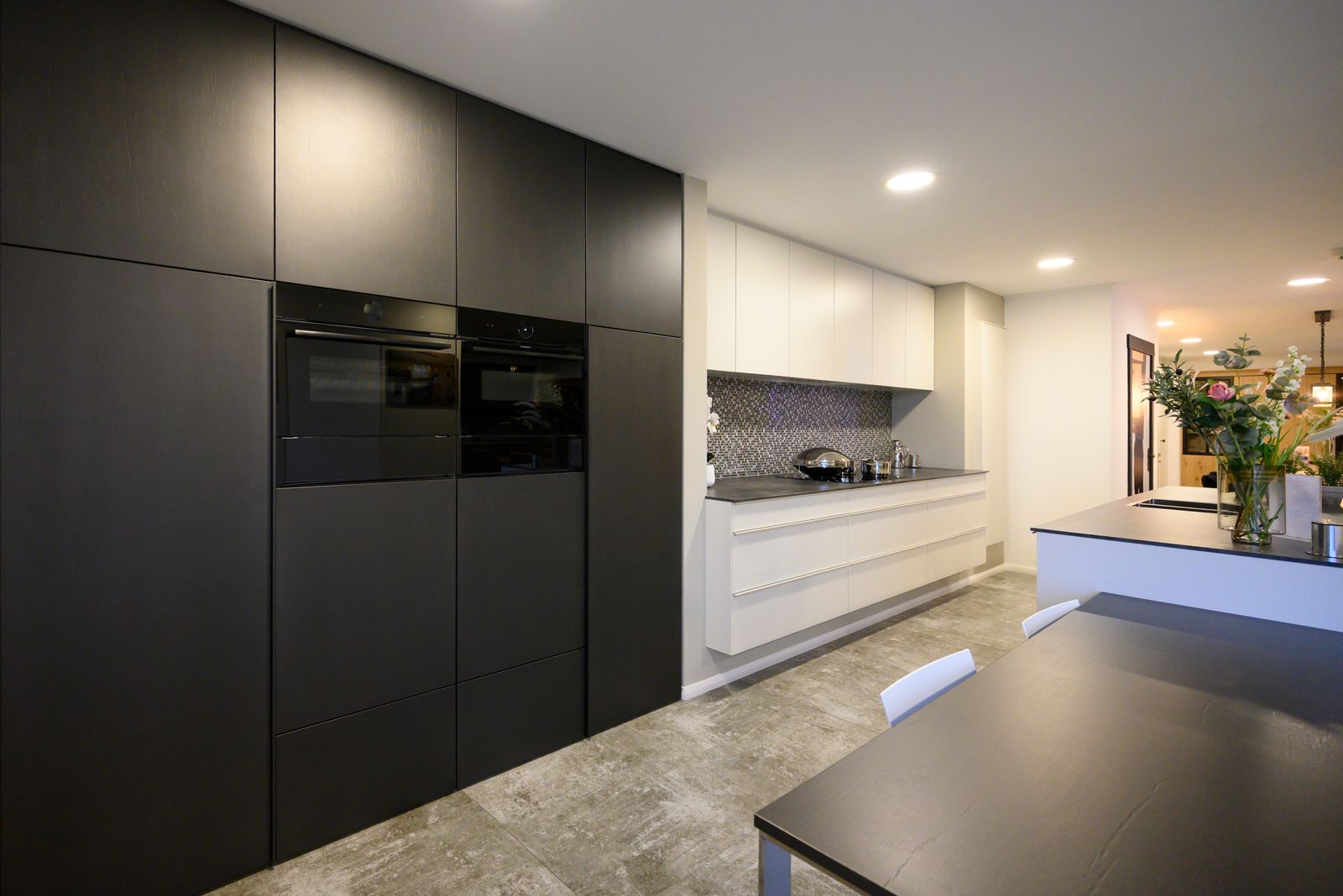 Alle toestellen zijn netjes geïntegreerd in de kastenwand en het eiland, waardoor het geheel zeer strak oogt.