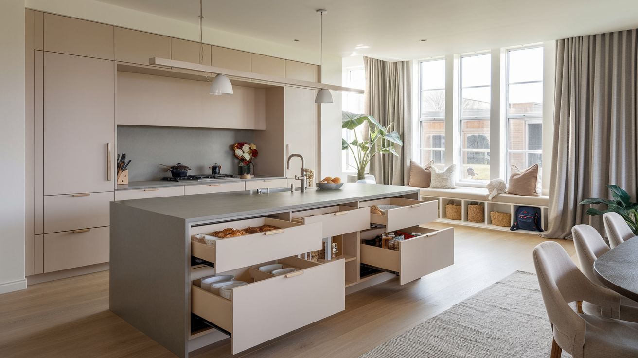 Een opgeruimde keuken begint bij voldoende en slimme opbergruimte. In een open leefkeuken is het extra belangrijk dat dagelijkse spullen niet voortdurend in het zicht liggen. Denk aan maatwerkkasten tot aan het plafond, diepe lades, verborgen opbergvakken en multifunctionele meubels zoals een bank met opbergruimte.