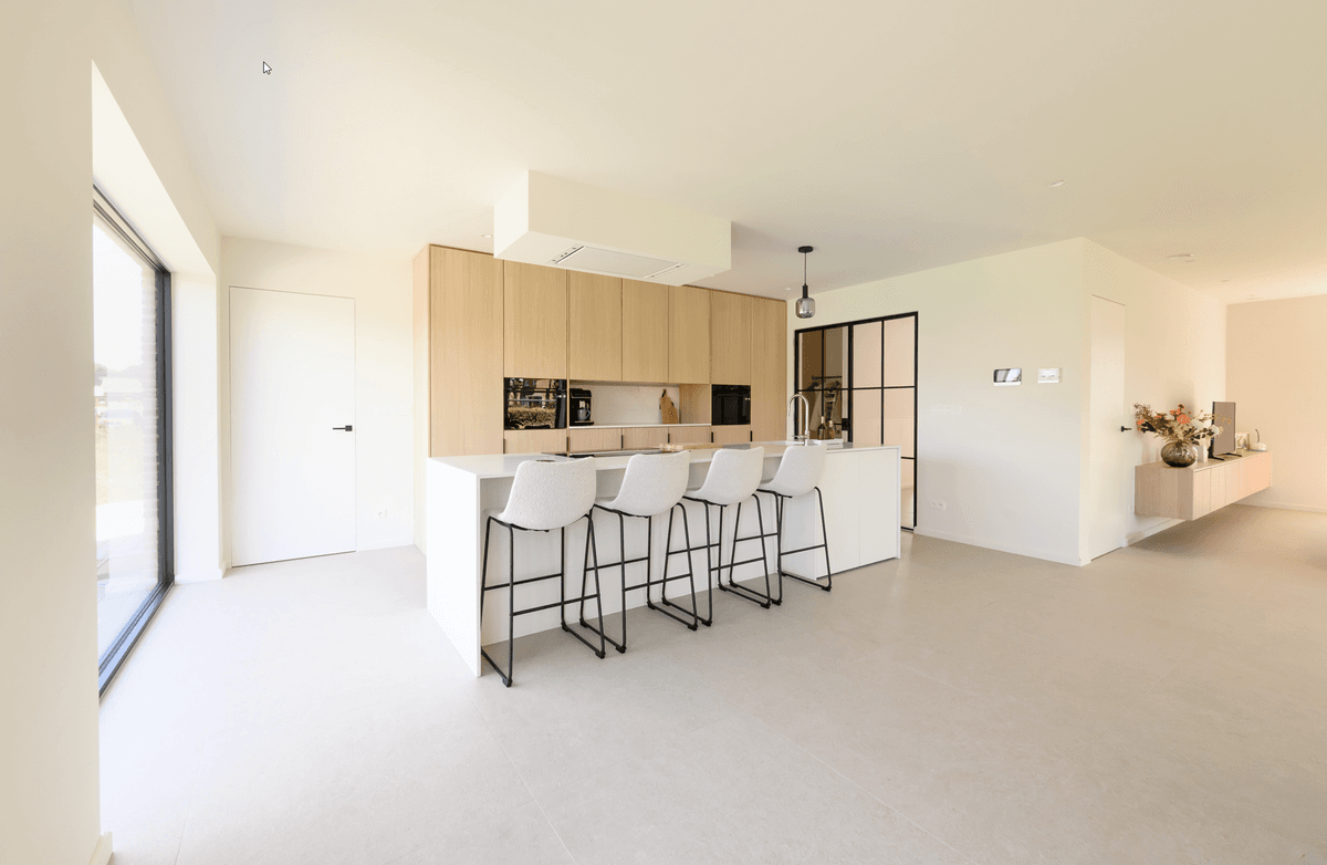 Voor Joeri en Dagmar uit Maasmechelen heeft onze verkoper Danny verschillende elementen in hun woning ontworpen, waaronder de keuken, tv-meubel, halkast, dressing, wasplaats/berging en de badkamer, alles in gebeitst eik fineer.